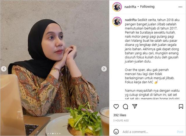 "Sedikit cerita, tahun 2018 aku pengen banget jualan Jilbab setelah memutuskan berhijab di tahun 2017," cerita Nadya di Instagram pada Kamis (21/7).
