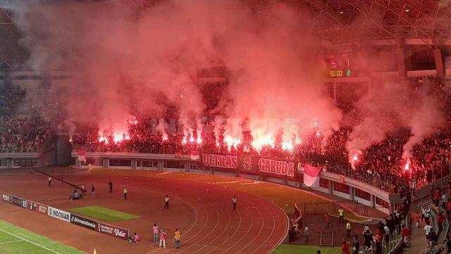 Ultras Garuda di tribun saat menyalakan flare dalam laga timnas Indonesia U-19 di Piala AFF, Minggu (10/7/22).