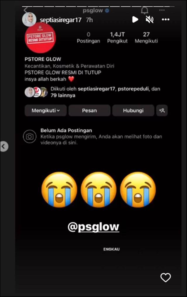 Setelah surat itu terkuak, Septia mengunggah postingan dengan tambahan emoji menangis. Ia merasa kehilangan usai Putra memutuskan menutup PS Glow. Septia juga mengungkap jika akun sosmed PS Glow sudah tak lagi aktif. Postingan dari akun tersebut juga sudah lenyap. "PSTORE GLOW RESMI DI TUTUP insya allah berkah ❤️," demikian keterangan di bio akun PS Glow itu.