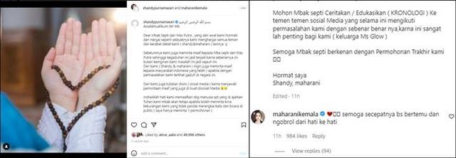 "InshaAllah hati kami memaafkan sbg manusia spt yang di ajarkan Tuhan kami mbak akan tetapi apabila boleh meminta krna kekurangan kami yang tidak pandai merangkai kata dan bicara di public ( saya hanya meminta 1 permohonan ) Mohon Mbak septi Ceritakan / Edukasikan ( KRONOLOGI ) Ke temen temen sosial Media yang selama ini mengikuti permasalahan kami dengan sebenar benar nya,karna ini sangat lah penting bagi kami ( keluarga Ms Glow )," ujar Shandy dan Maharani. "Semoga secepatnya bs bertemu dan ngobrol dari hati ke hati."