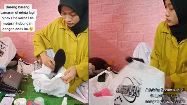"Barang-barang lamaran diminta lagi pihak pria karena dia mutusin hubungan dengan adikku," tulis akun TikTok @sayaratna.