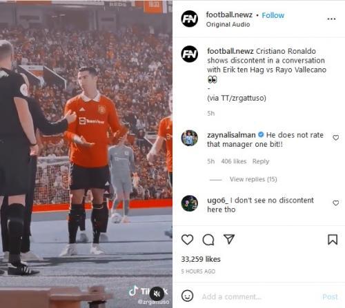 “Cristiano Ronaldo menunjukan ketidakpuasan dalam percakapan dengan Erik Ten Hag di laga kontra Rayo Vallecano,” tulis @football.newz.