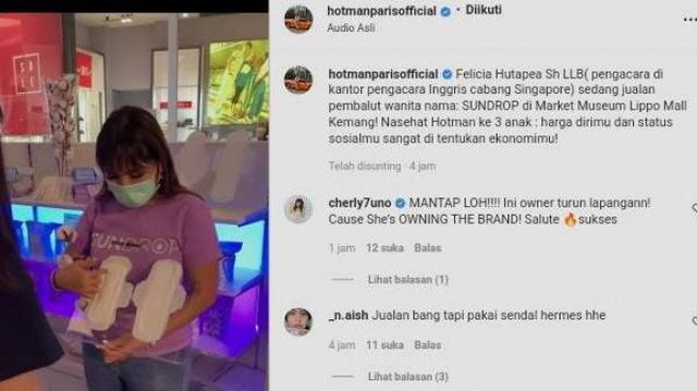 "Felicia Hutapea Sh LLB( pengacara di kantor pengacara Inggris cabang Singapore) sedang jualan pembalut wanita nama: SUNDROP di Market Museum Lippo Mall Kemang! Nasehat Hotman ke 3 anak : harga dirimu dan status sosialmu sangat di tentukan ekonomimu!" tulis Hotman dilansir IntipSeleb dari Instagram @hotmanparisofficial.