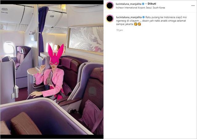Lucinta Luna baru saja memperbarui feed Instagramnya dengan sebuah foto di dalam pesawat. Artis sekaligus penyanyi yang akrab disapa Luna ini memamerkan dandanannya yang cukup ngejreng.