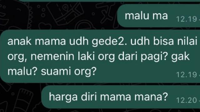 "Mama punya anak di rumah. Jaga kelakuan. Jalan kok gak bilang-bilang, mau jadi apa? Mending gak usah punya anak saja mama dari dulu, kalau kelakuannya begini."