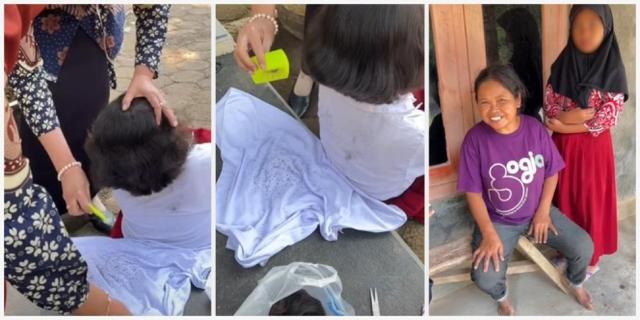 Tidak hanya membersihkan dengan sisir, Bu Zera dan rekan sesama guru juga memotong pendek rambut anak tersebut.